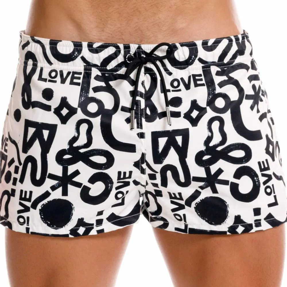 Short de bain en microfibre douce et légère, séchant rapidement. Imprimé LOVE très tendance. Ceinture élastique avec cordon de serrage. Slip intérieur pour plus de confort et de maintien. 2 poches latérales, et une poche arrière avec oeillet métallique.