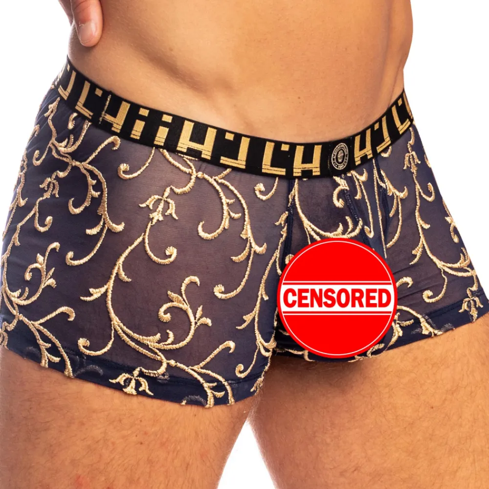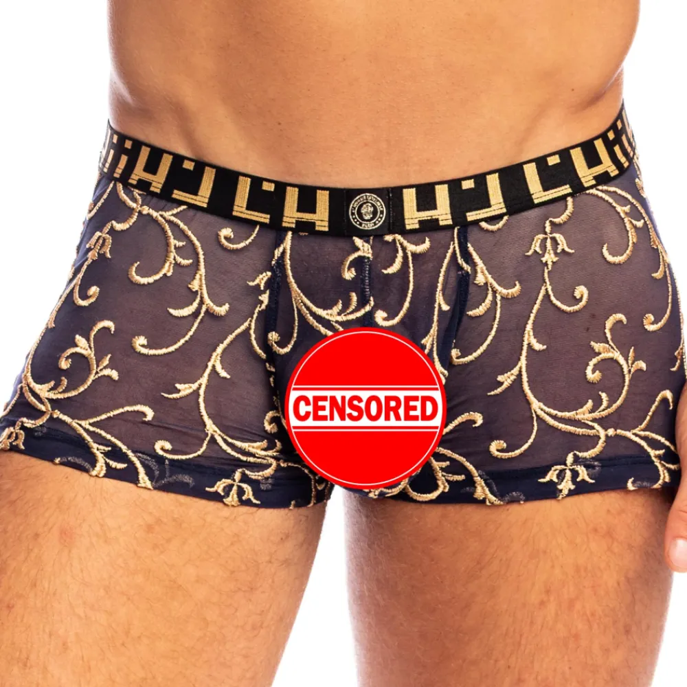 Shorty luxueux et raffiné en tulle léger et transparent. Tissu brodé d’arabesques dorées rappelant les fastes de Versailles. Poche frontale ergonomique push up non doublée. Absence de couture à l’arrière et sur les côtés, pour un effet seconde peau. Ceinture élastique signée L’Homme Invisible.