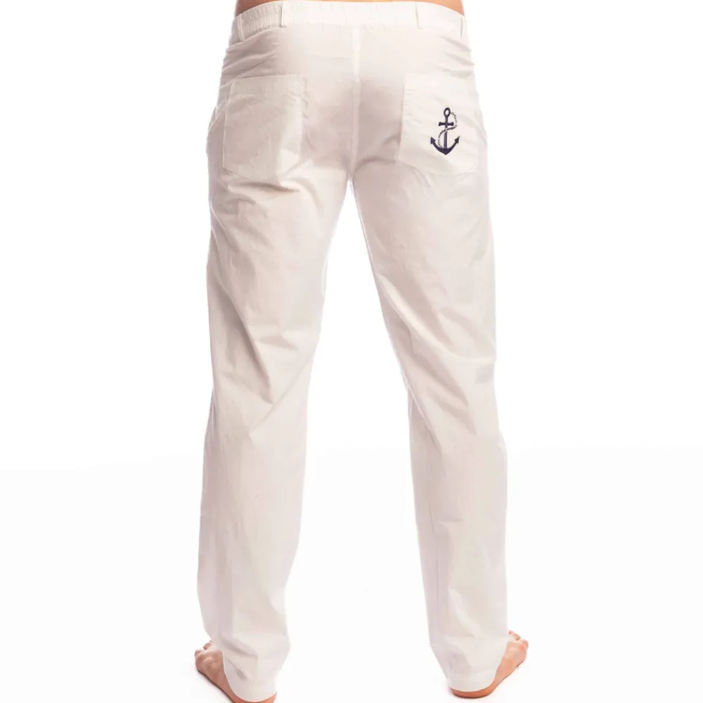 Pantalon inspiré du style matelot, en coton léger et confortable. Coupe taille basse ajustée. Boutonnage horizontal fonctionnel devant, souligné par des rayures façon marinière. 4 poches. Ancre brodée sur la poche arrière droite. Ceinture élastiquée avec passants et braguette 2 boutons.