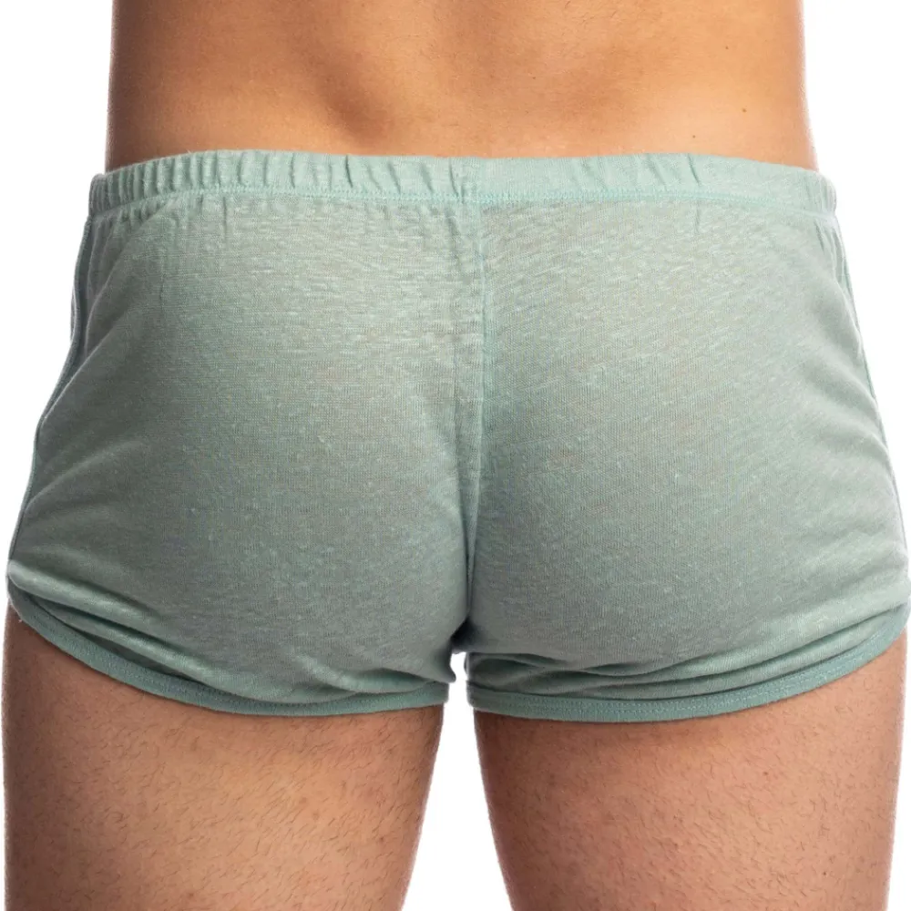 Short court en jersey de lin 100% naturel, léger et confortable. Tissu fluide, respirant et semi-transparent. Coupe taille basse ajustée, échancrée sur les côtés. Fine ceinture élastique recouverte.