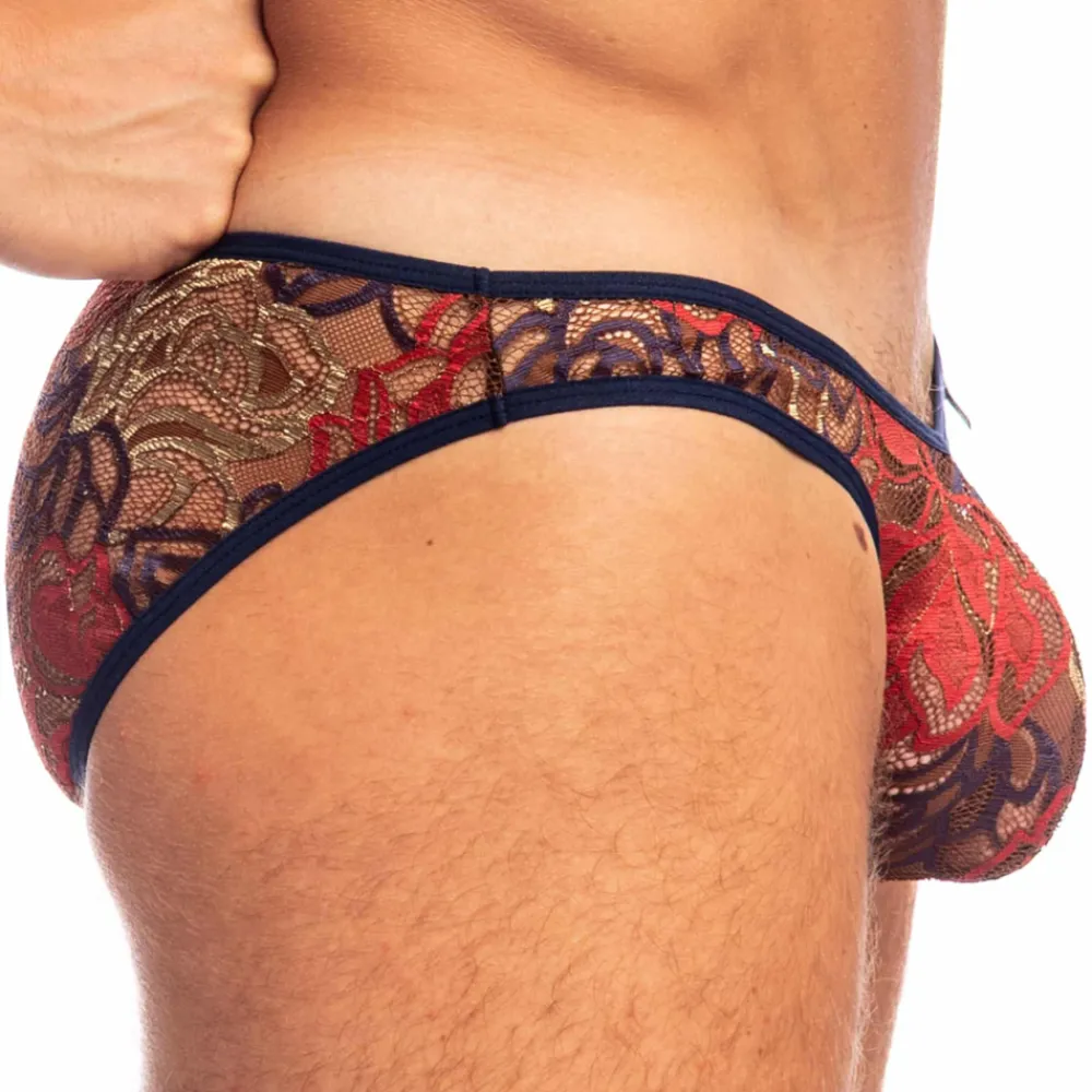 Slip élégant et sophistiqué en dentelle italienne à motif floral chatoyant et ajouré. Bordures de couleur contrastée. Coupe minimaliste super taille basse. Poche frontale non doublée. Fine ceinture élastique.