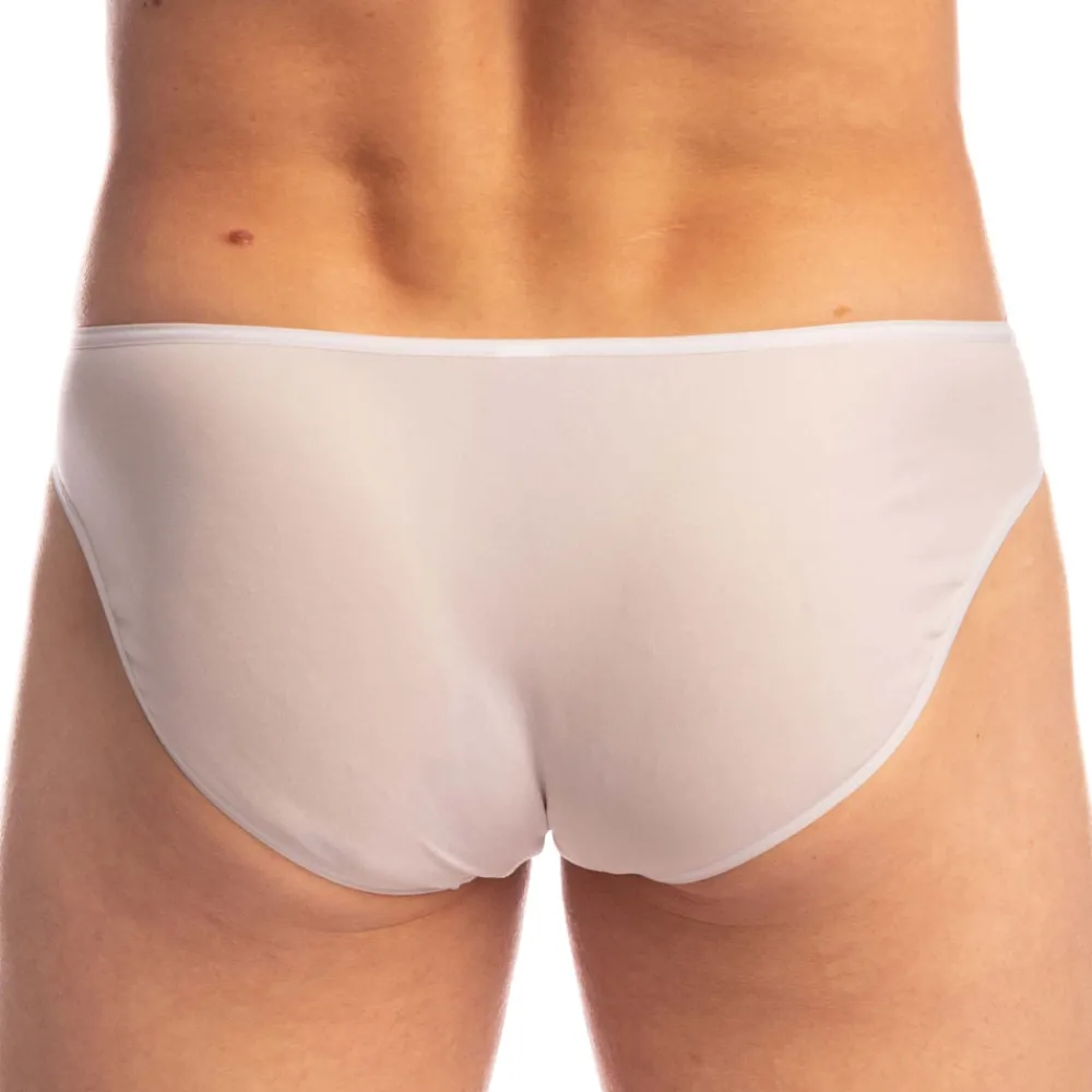 Slip sexy et audacieux en tissu blanc, très fin, doux, fluide et aérien comme de la mousseline. Coupe minimaliste super taille basse. Poche frontale non doublée. Fine ceinture élastique.