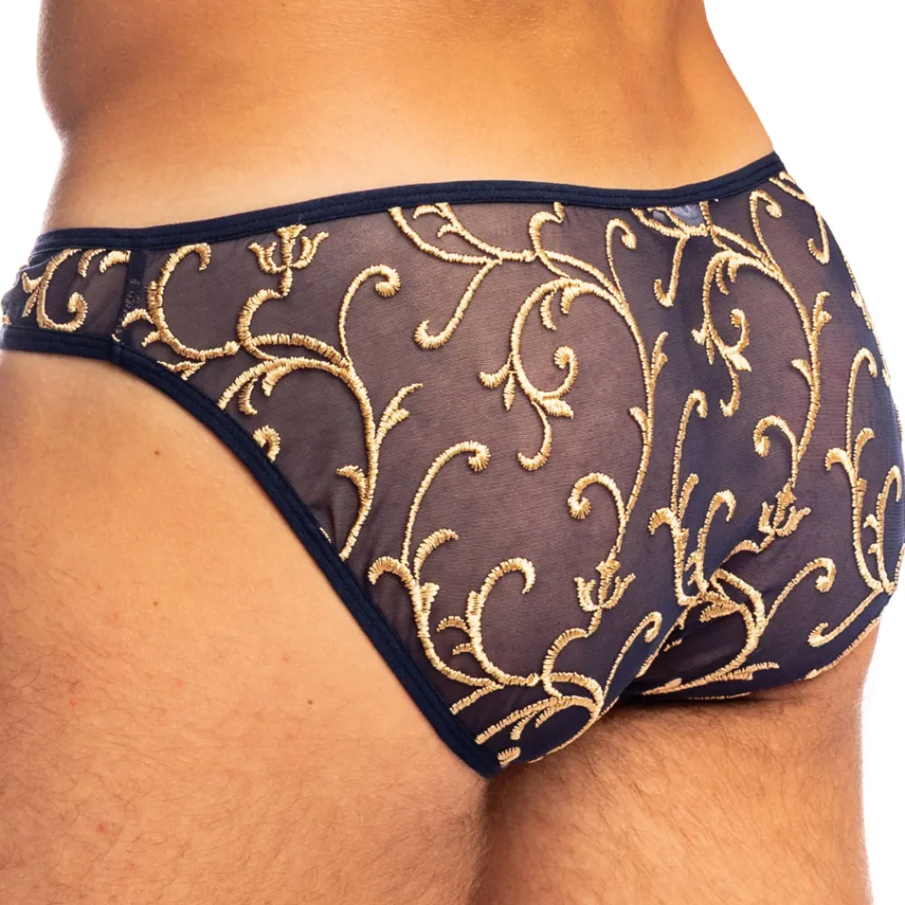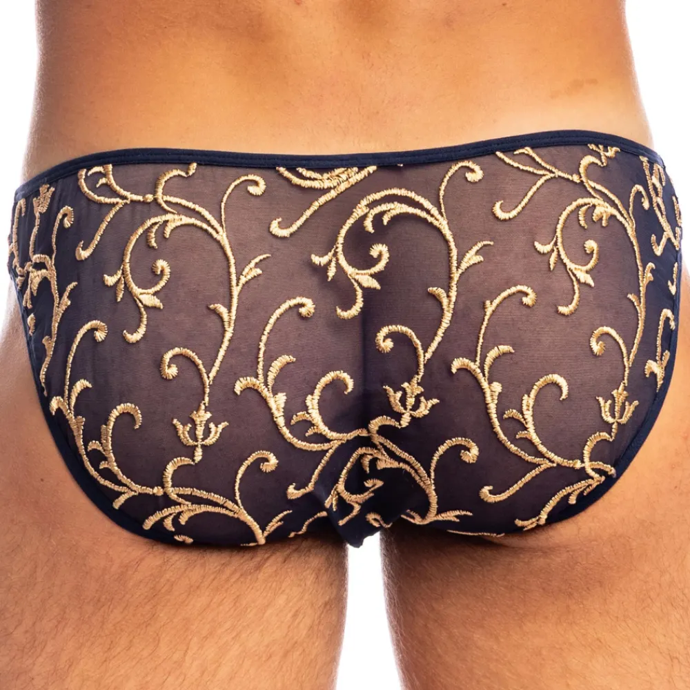 Slip luxueux et raffiné en tulle léger et transparent. Tissu brodé d’arabesques dorées rappelant les fastes de Versailles. Coupe minimaliste super taille basse. Poche frontale préformée, non doublée. Fine ceinture élastique.