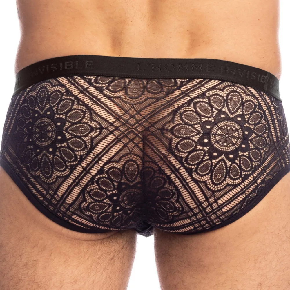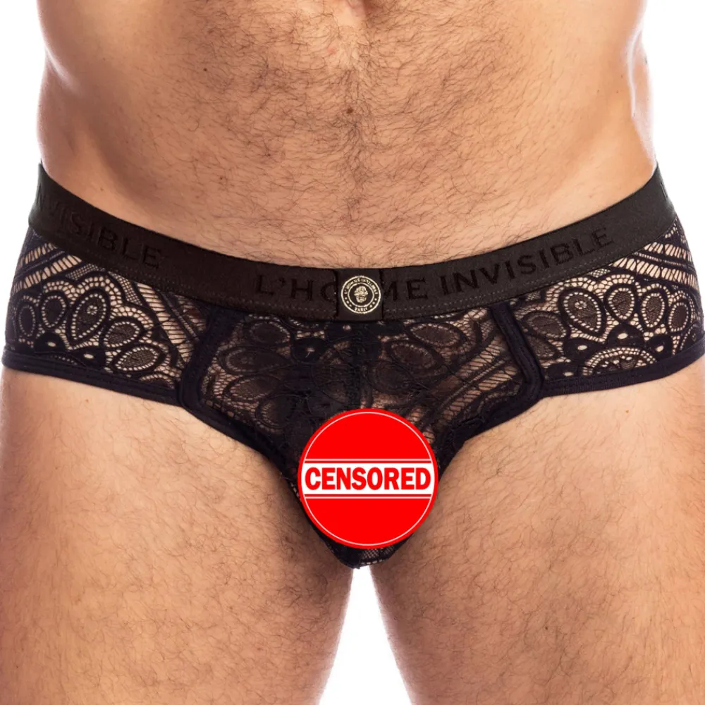Slip élégant et sophistiqué en dentelle douce, légère et confortable. Tissu transparent orné d’un superbe motif. Coupe taille basse ajustée. Poche frontale ergonomique push up non doublée, pour une totale transparence. Ceinture élastique signée L’homme Invisible.