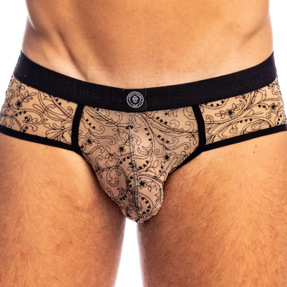Slip luxueux et raffiné en fine résille couleur chair, délicate et semi-transparente. Tissu brodé d’un motif baroque sophistiqué qui dessine comme un tatouage à même la peau. Coupe taille basse ajustée. Poche frontale ergonomique push up non doublée. Ceinture élastique signée L’Homme Invisible.