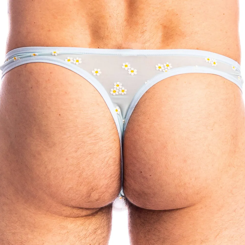 String sensuel et romantique en tulle transparent de confection italienne. Paquerettes floquées. Coupe minimaliste super taille basse. Poche frontale préformée non doublée. Etiquette L’Homme Invisible cousue sur la fine ceinture élastique.