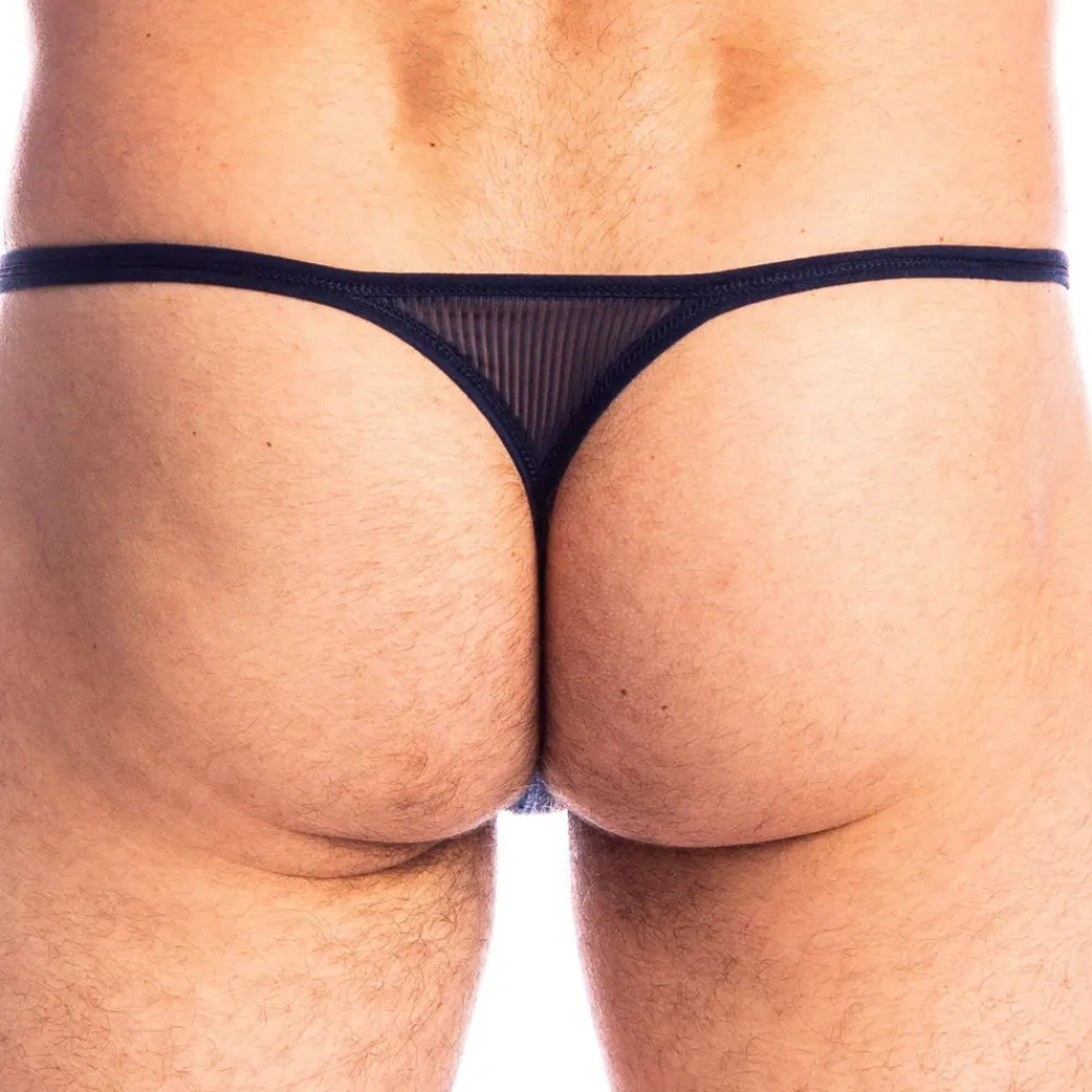 String moderne et épuré en fine maille transparente, rayée, douce et légère. Coupe minimaliste avec clips fonctionnels. Poche frontale non doublée. Design en Y à l’arrière pour mettre en valeur votre fessier.