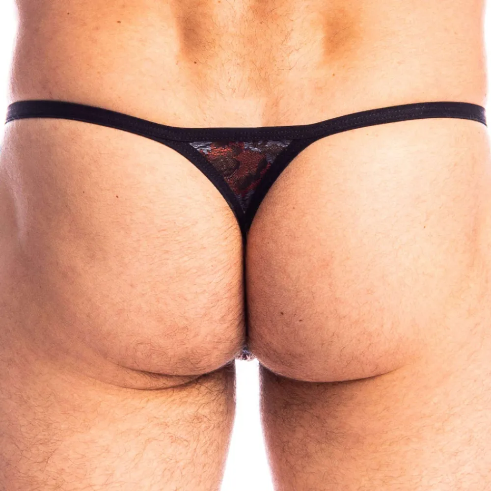 String luxueux et élégant en dentelle transparente de confection italienne. Motif floral d’inspiration baroque. Coupe minimaliste avec clips fonctionnels. Poche frontale non doublée. Design en Y à l’arrière pour mettre en valeur votre fessier.