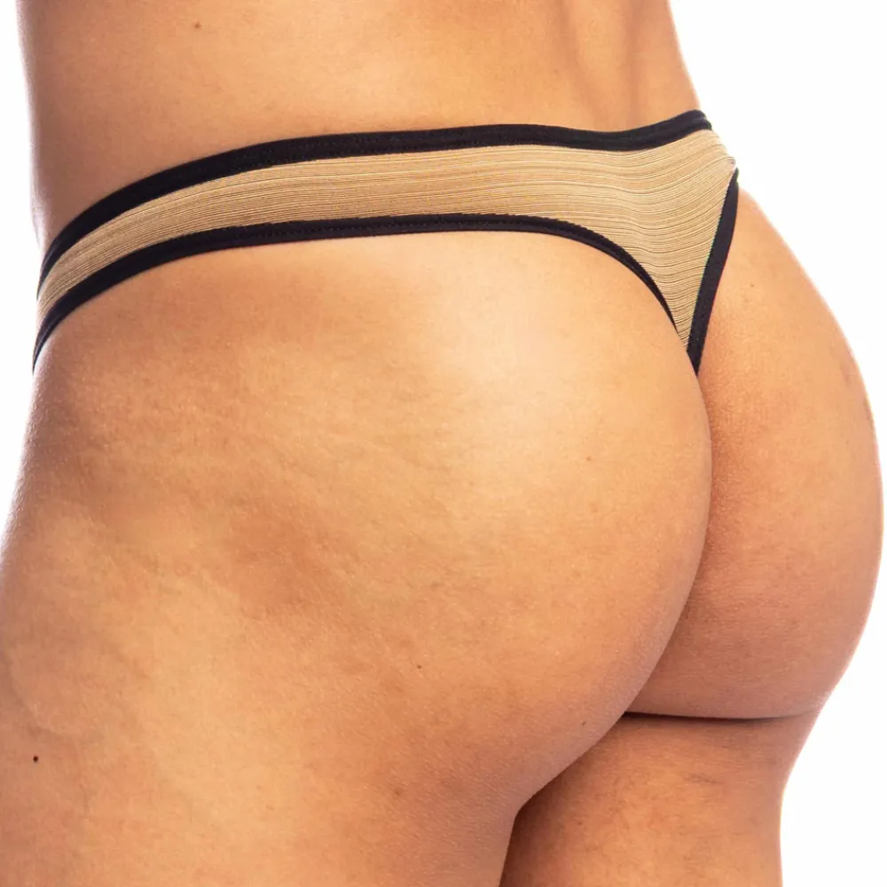 String sensuel en microfibre extensible, douce et confortable. Tissu doré aux reflets moirés très luxueux. Coupe avant très échancrée en V. Bordures de couleurs contrastée. Poche frontale ergonomique profonde. Découpe en Y sur les fesses. Etiquette L’Homme Invisible cousue sur la fine ceinture élastique.