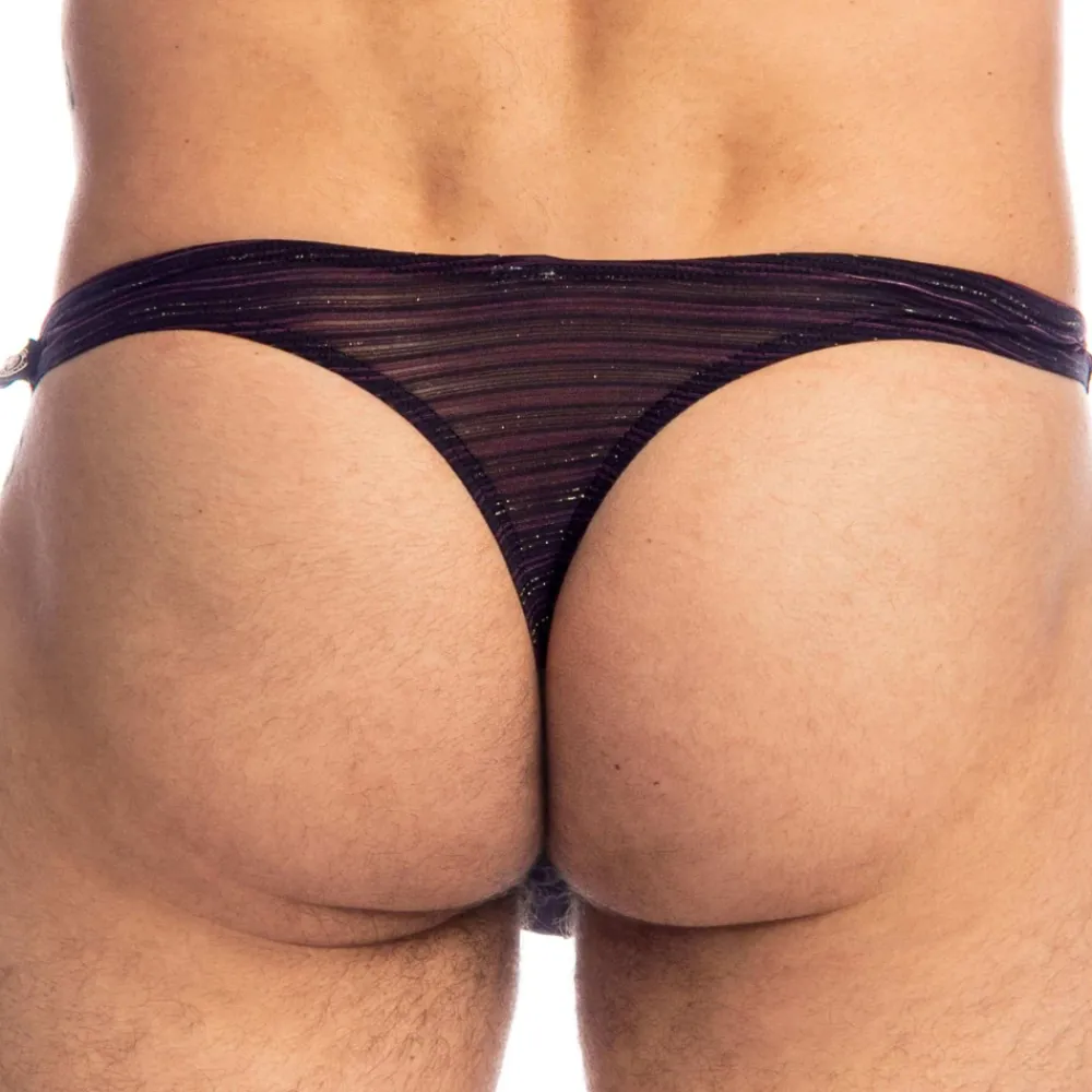 String glamour et élégant en tissu ultra soyeux, léger et confortable. Fines rayures qui mettent en valeur les formes du corps. Fils métallisés Lurex pour un subtil effet pailleté. Coupe minimaliste taille basse. Poche frontale ergonomique non doublée. Bordures contrastées.