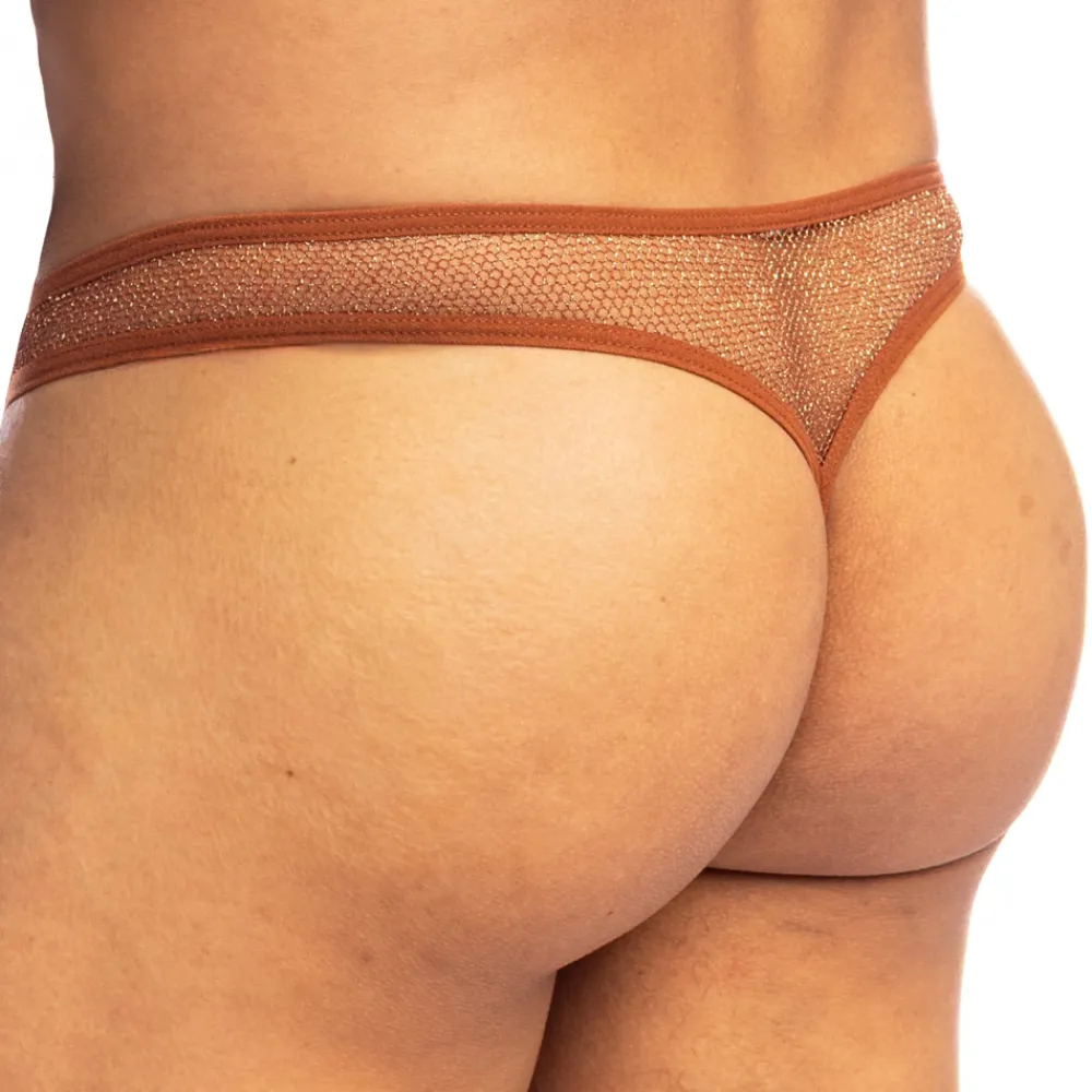 String érotique et sophistiqué en résille italienne rouge cuivrée, tissée de fils métallisés Lurex. Coupe avant très échancrée en V. Poche frontale ergonomique profonde. Découpe en Y sur les fesses. Etiquette L’Homme Invisible cousue sur la fine ceinture élastique.