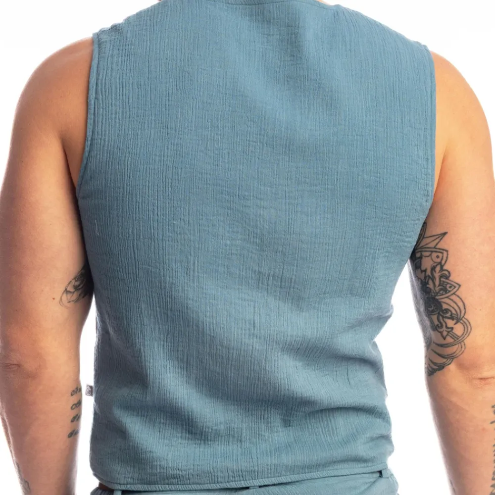 Veste sans manches en crêpe léger 100% coton. Coupe cintrée. Fermeture 5 boutons. 2 poches.