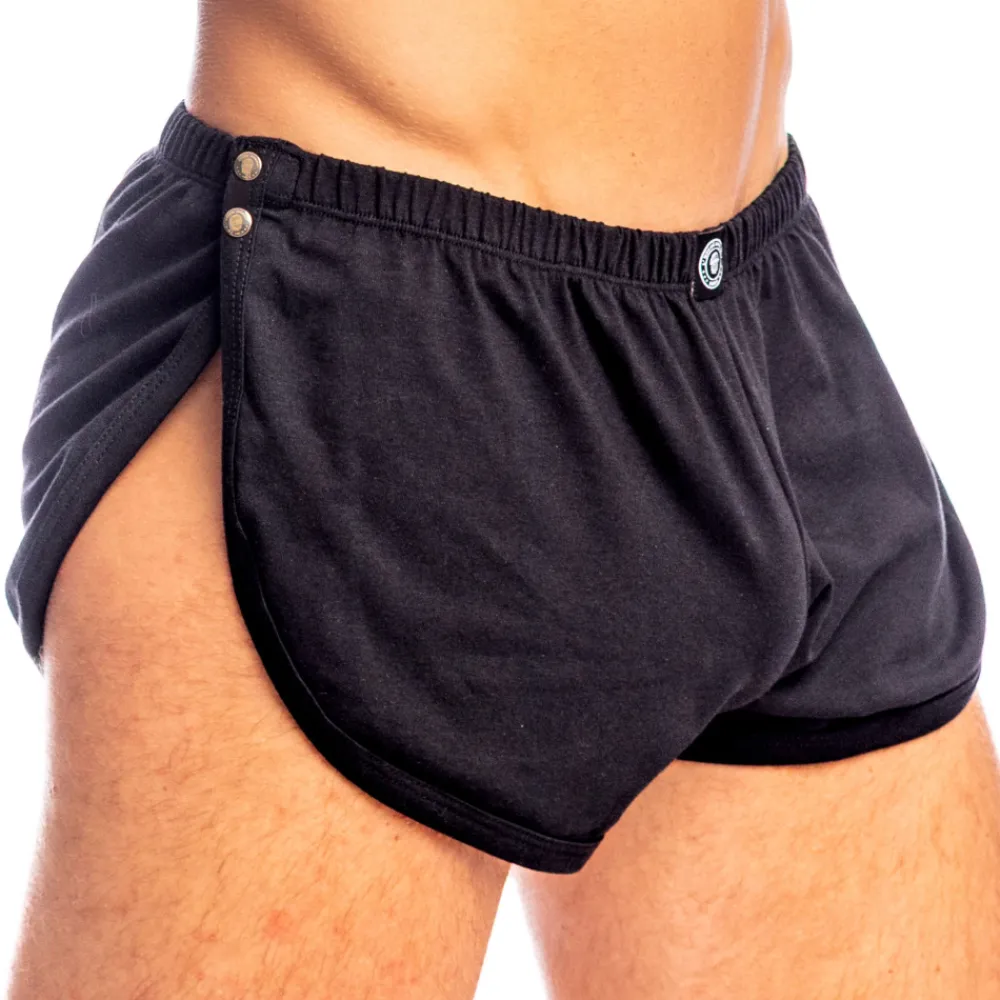 Short original et audacieux en coton doux et respirant. Coupe ultra échancrée avec ouverture fonctionnelle par 2 boutons-pression de chaque côté. Etiquette L’Homme Invisible cousue sur la ceinture élastique recouverte.