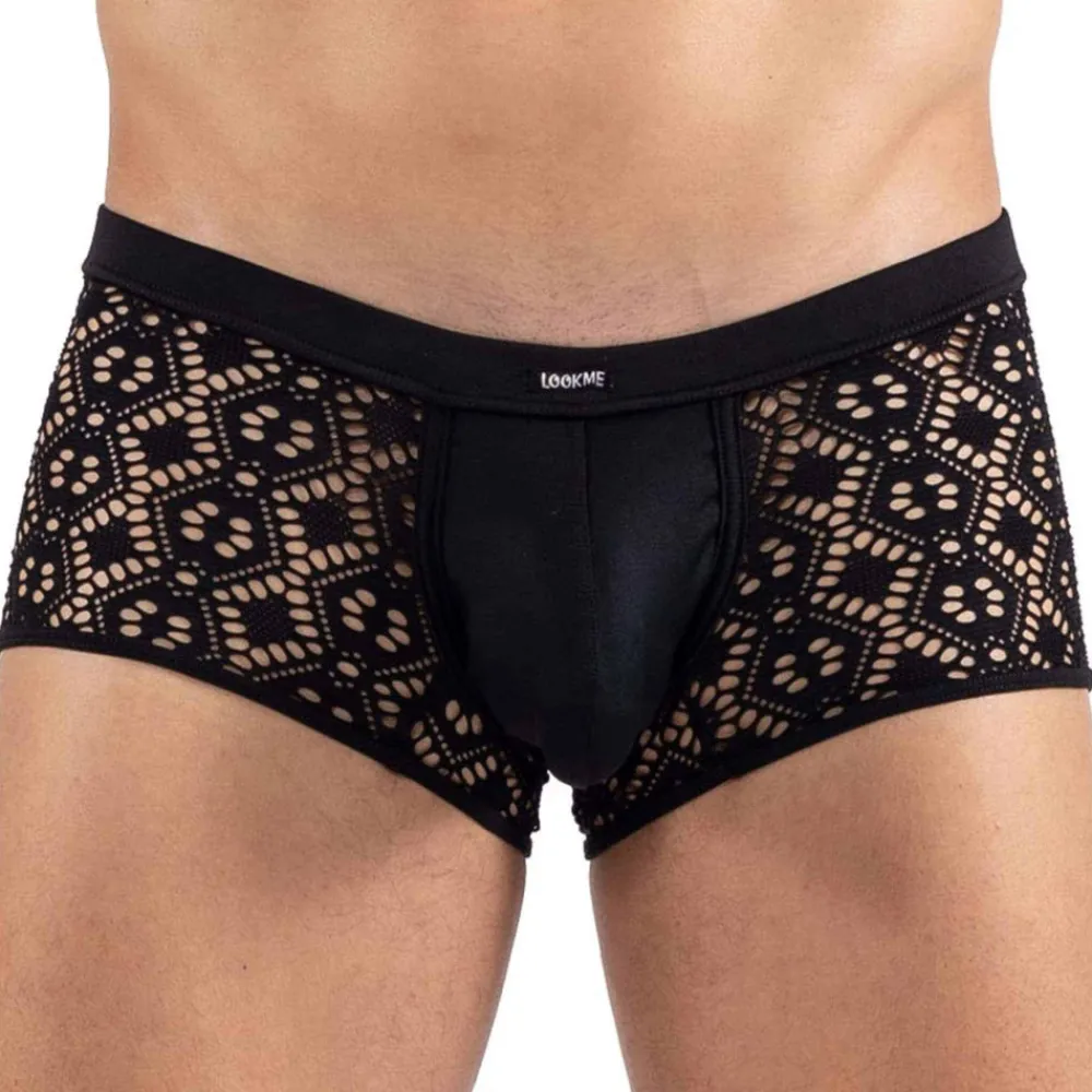 Boxer sexy en résille extensible transparente, ornée d’un motif géométrique. Poche frontale en microfibre opaque, non doublée. Coupe très ajustée. Ceinture élastique recouverte.