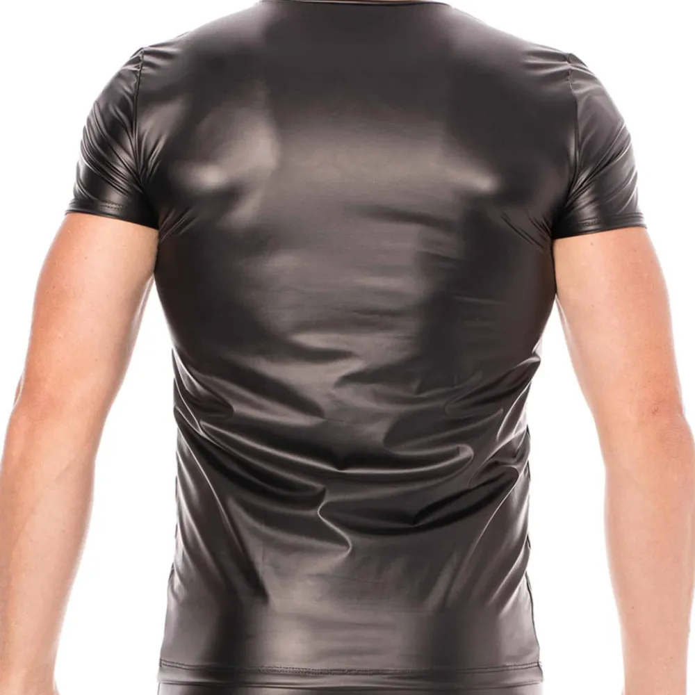 T-Shirt sexy et provocant en simili cuir extensible, souple et confortable. Col rond et manches courtes. Coupe ajustée pour souligner vos formes.