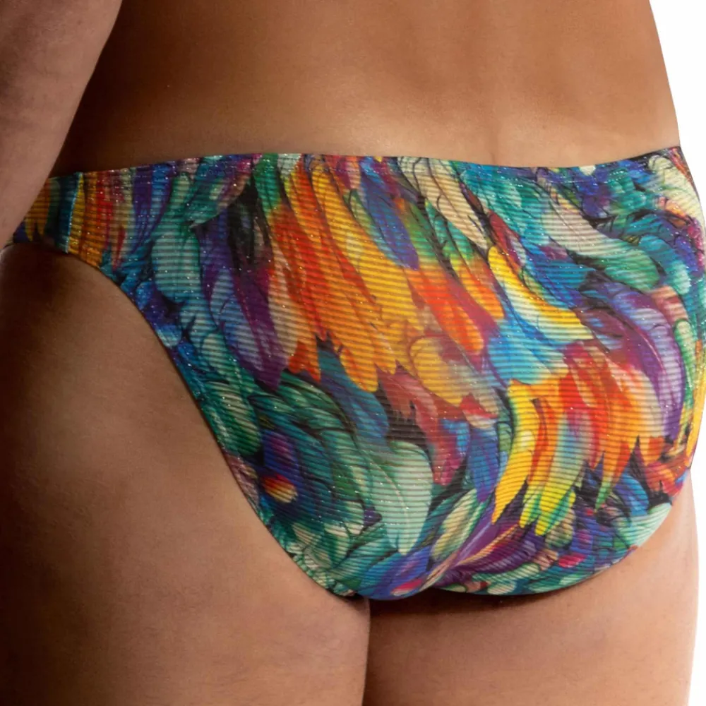 Slip taille basse en microfibre extensible, douce et confortable. Imprimé constitué de plumes multicolores sur un fond pailleté alternant rayures opaques et transparentes. Coupe simple et élégante. Poche frontale préformée, non doublée. Etiquette Manstore cousue sur la fine ceinture élastique recouverte.