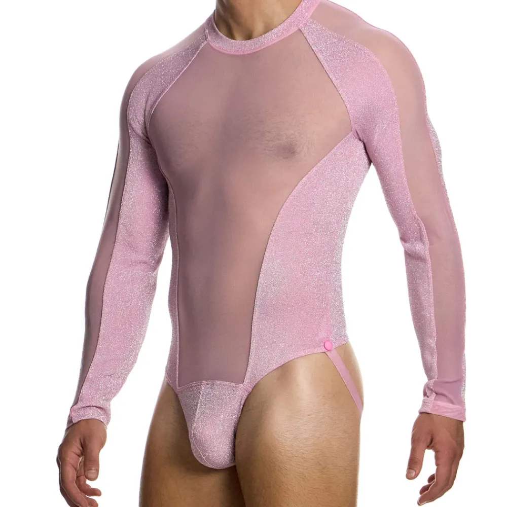Body jock glamour combinant tulle transparent et microfibre tricotée avec des fils métallisés pour un effet pailleté scintillant. Manches longues et col rond. Les straps à l’arrière se détachent grâce à deux boutons pression. Etiquette Modus Vivendi argentée cousue en haut du dos.