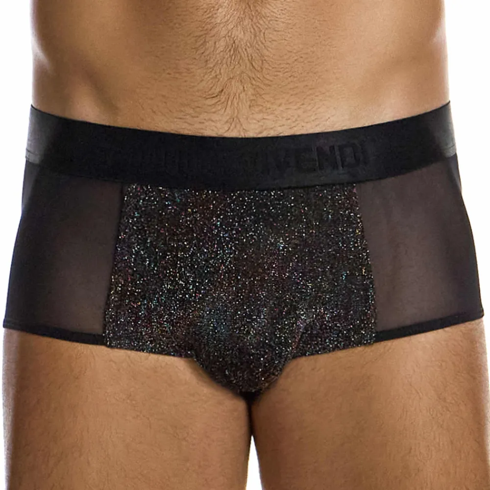 Boxer glamour combinant tulle transparent et microfibre tricotée avec des fils métallisés présentant des reflets multicolores. Ceinture élastique signée Modus Vivendi.