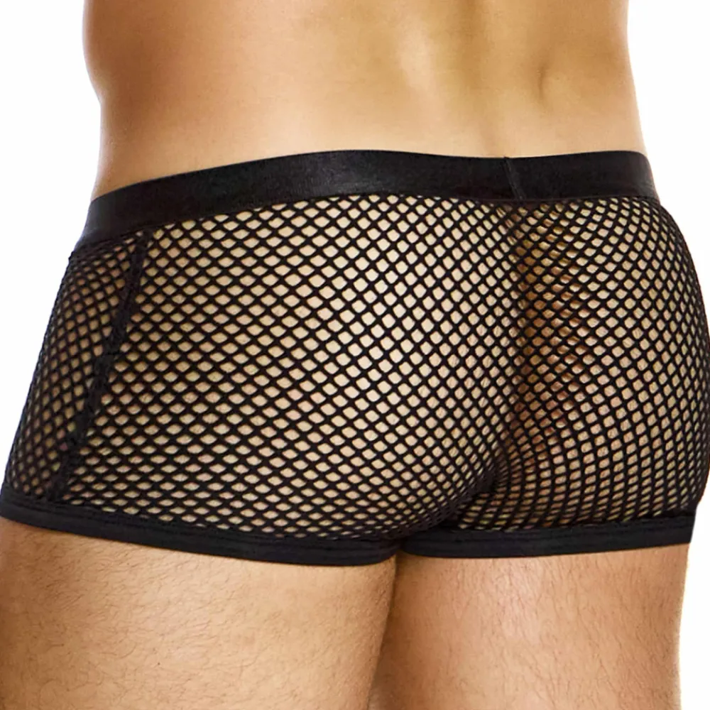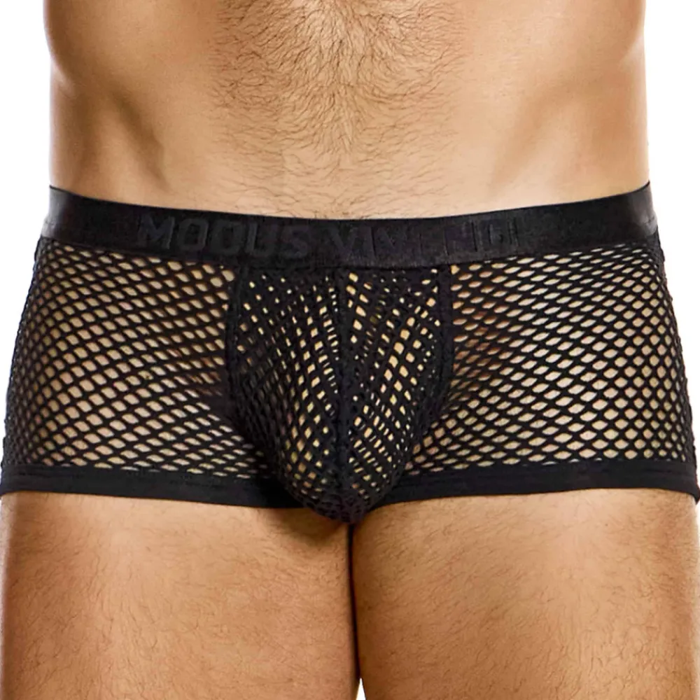 Boxer taille basse provocant en résille dont le maillage très large laisse peu de place à l’imagination. Poche frontale doublée. Coupe ajustée et très sexy. Fine ceinture élastique satinée signée Modus Vivendi ton sur ton.