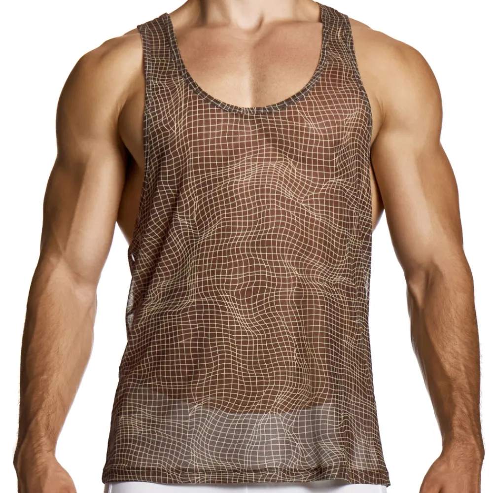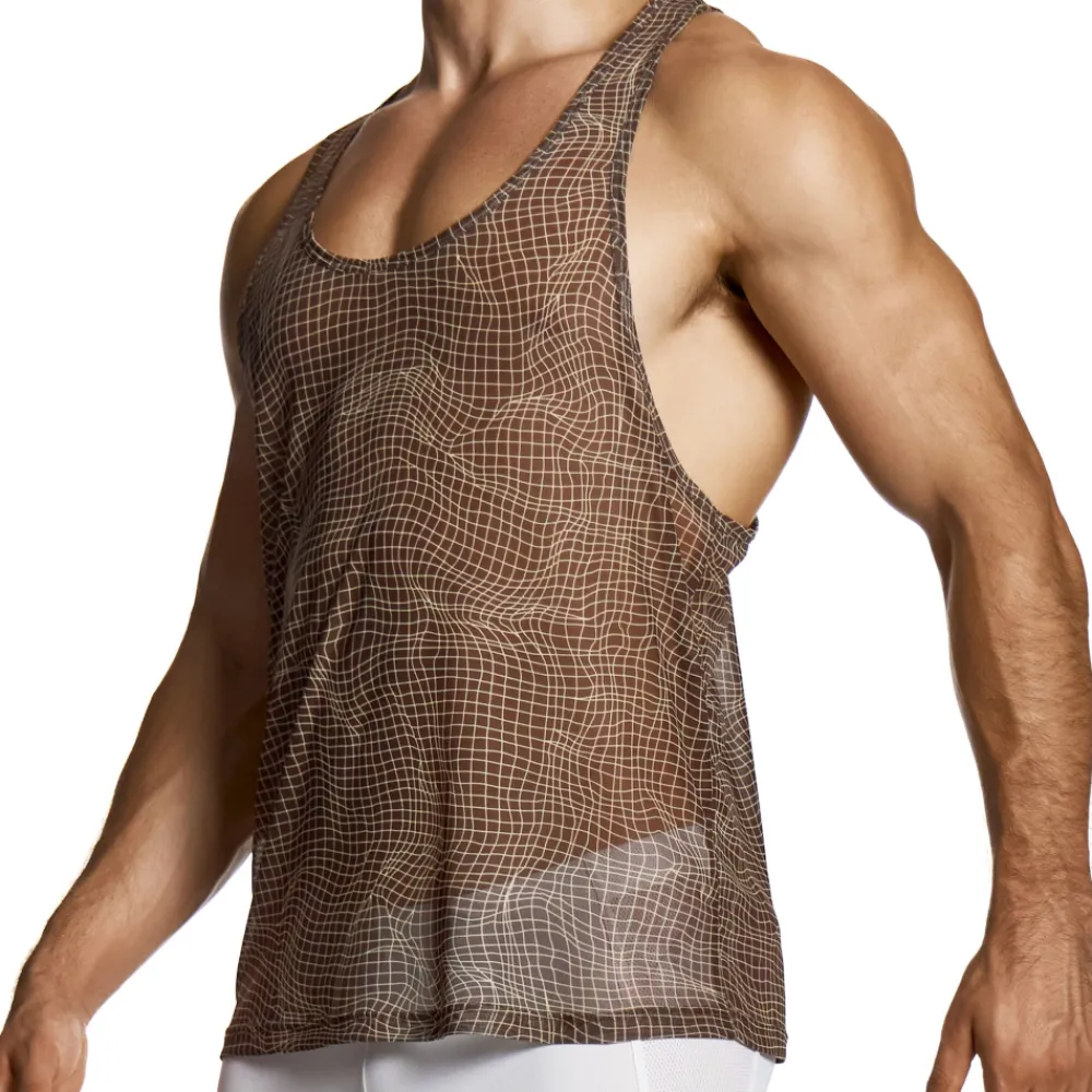 Débardeur sensuel en fine résille légèrement transparente et très douce, pour en effet seconde peau. Motif géométrique abstrait qui révèle subtilement le corps tout en mettant en valeur vos formes, pour un impact visuel maximal. Col en U et larges ouvertures sous les bras. Dos nageur. Logo Modus Vivendi en silicone dans le dos.
