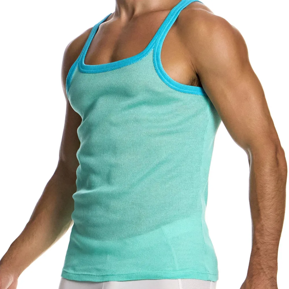 Débardeur en micro-résille extensible, fine et légèrement transparente de couleur pop. Col carré. Bordures de couleur contrastée. Etiquette Modus Vivendi en silicone cousue dans le dos.