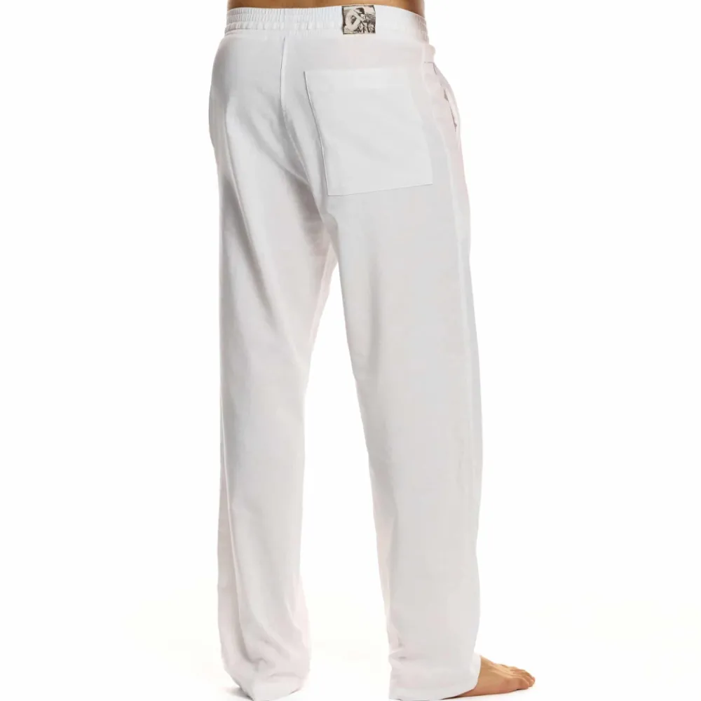 Pantalon droit en tissu léger à base de lin. 3 poches. Ceinture élastique avec cordon de serrage. Etiquette MV cousue à l’arrière.