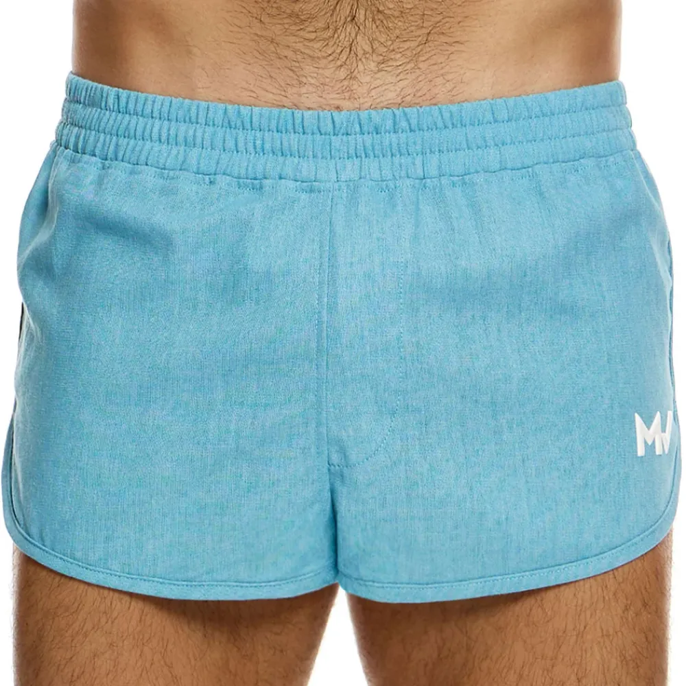 Short sexy en tissu léger et respirant à base de lin. Coupe courte et confortable, échancrée sur les côtés. Ceinture élastique recouverte. Logo MV en silicone sur la cuisse gauche. Braguette factice.
