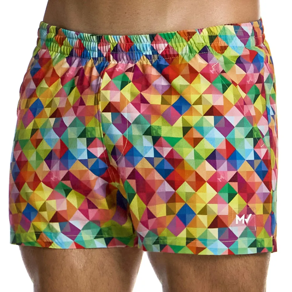 Short de bain mi-cuisse en microfibre séchant rapidement. Imprimé géométrique aux couleurs de l’arc-en-ciel. Coupe confortable avec 2 poches. Slip intérieur pour plus de confort et de maintien. Braguette factice. Ceinture élastique avec cordon de serrage intérieur. Etiquette MV en silicone cousue sur la cuisse gauche.