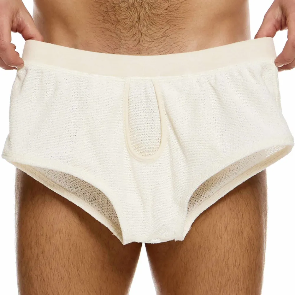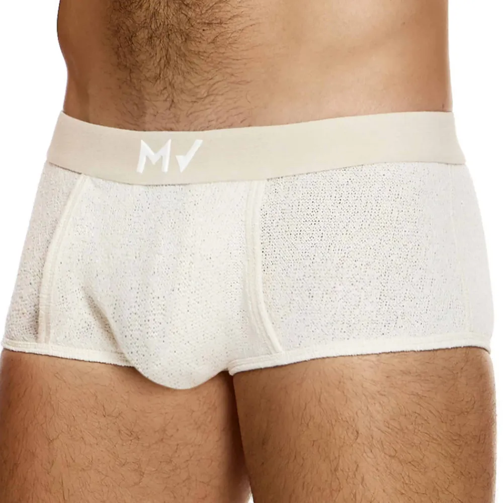 Boxer monochrome en maille tricotée fine, qui laisse légèrement entrevoir le corps en transparence. Coupe taille basse ajustée. Poche frontale doublée avec ouvertures sur les cotés pour un accès direct aux parties intimes. Ceinture élastique signée MV.