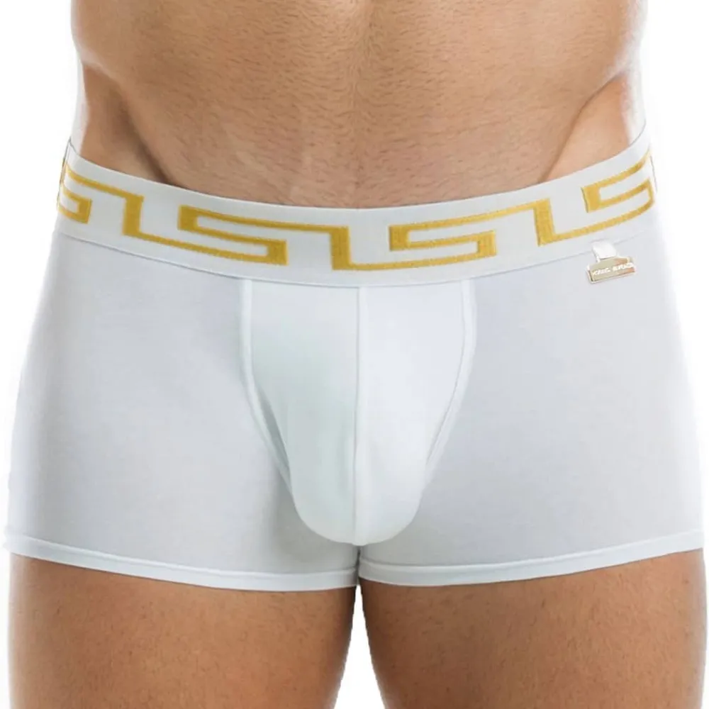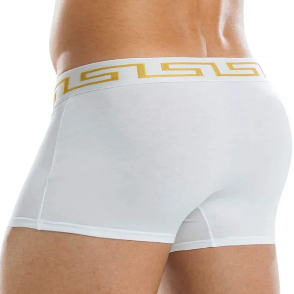 Boxer taille basse en coton doux. Poche frontale doublée pour plus de confort. Plaque métallique Modus Vivendi sur la hanche gauche. Motif inspiré par la Grèce antique sur la ceinture élastique.