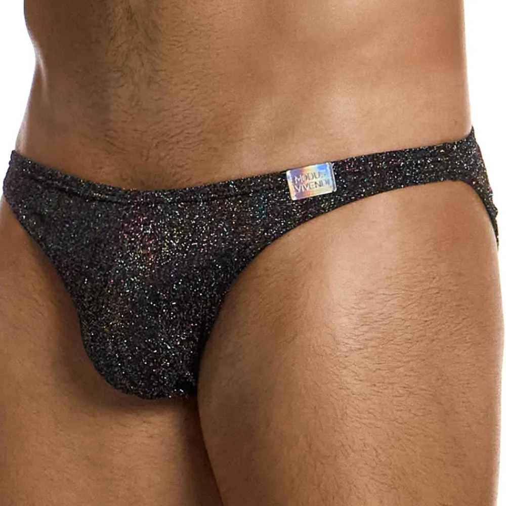 Slip glamour en microfibre tricotée avec des fils métallisés présentant des reflets multicolores. Coupe taille basse minimaliste. Poche frontale non doublée. Etiquette Modus Vivendi argentée cousue sur la hanche gauche.