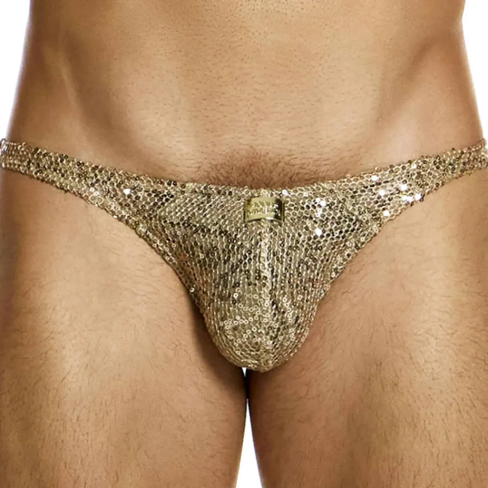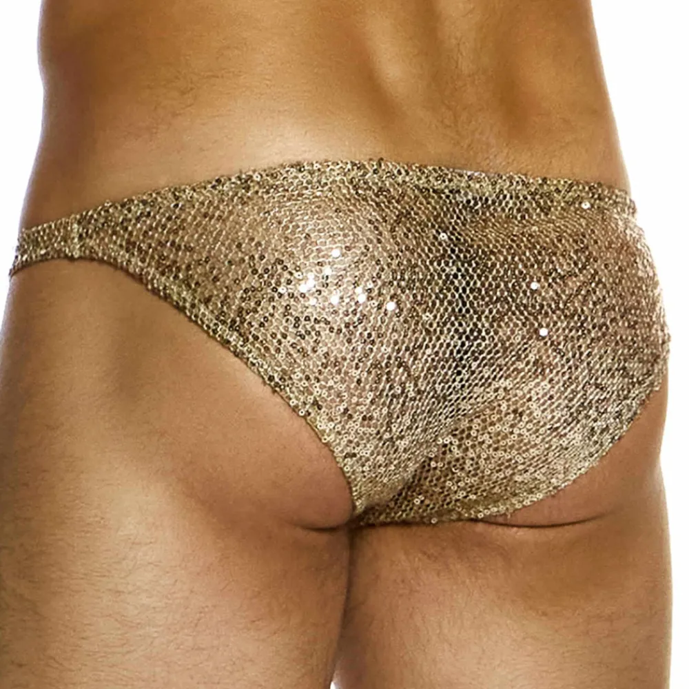 Slip glamour en résille extensible dorée recouverte de paillettes scintillantes. Coupe taille basse et minimaliste. Poche frontale doublée. Etiquette Modus Vivendi de couleur or sur la fine ceinture élastique.