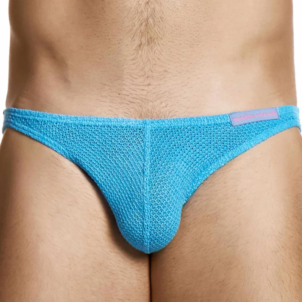 Slip monochrome très sexy en maille tricotée fine. La matière en crochet dévoile sensuellement le corps en transparence. Coupe minimaliste, taille basse et ajustée. Poche frontale non doublée. Etiquette Modus Vivendi cousue sur la fine ceinture élastique.