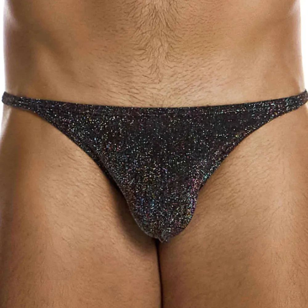 String glamour en microfibre tricotée avec des fils métallisés présentant des reflets multicolores. Coupe taille basse minimaliste. Poche frontale non doublée. Etiquette Modus Vivendi argentée cousue à l’arrière.