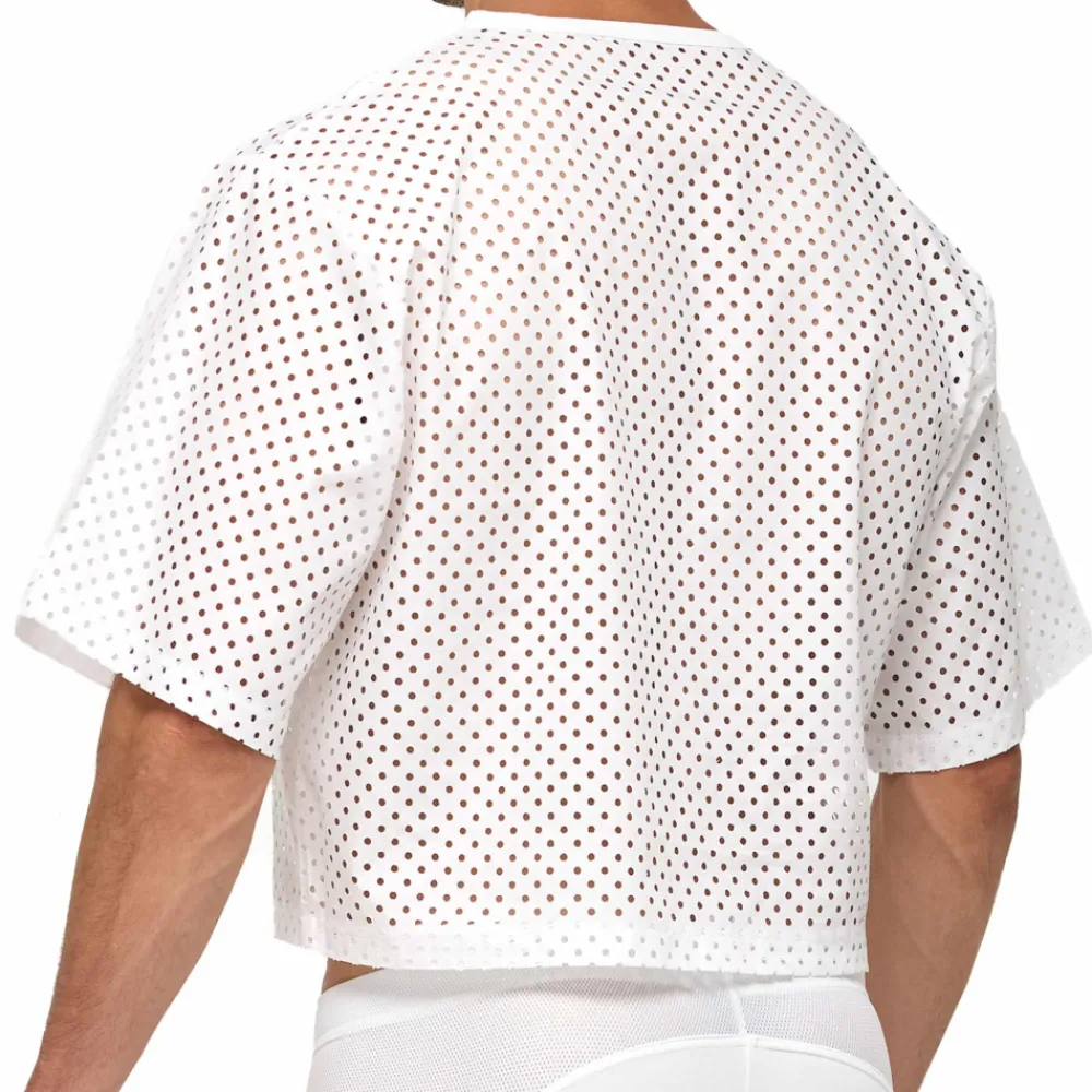 T-shirt rétro inspiré des années 80 en coton perforé. Coupe à la fois courte et oversize. Col rond. Etiquette Modus Vivendi en silicone sur la manche gauche.