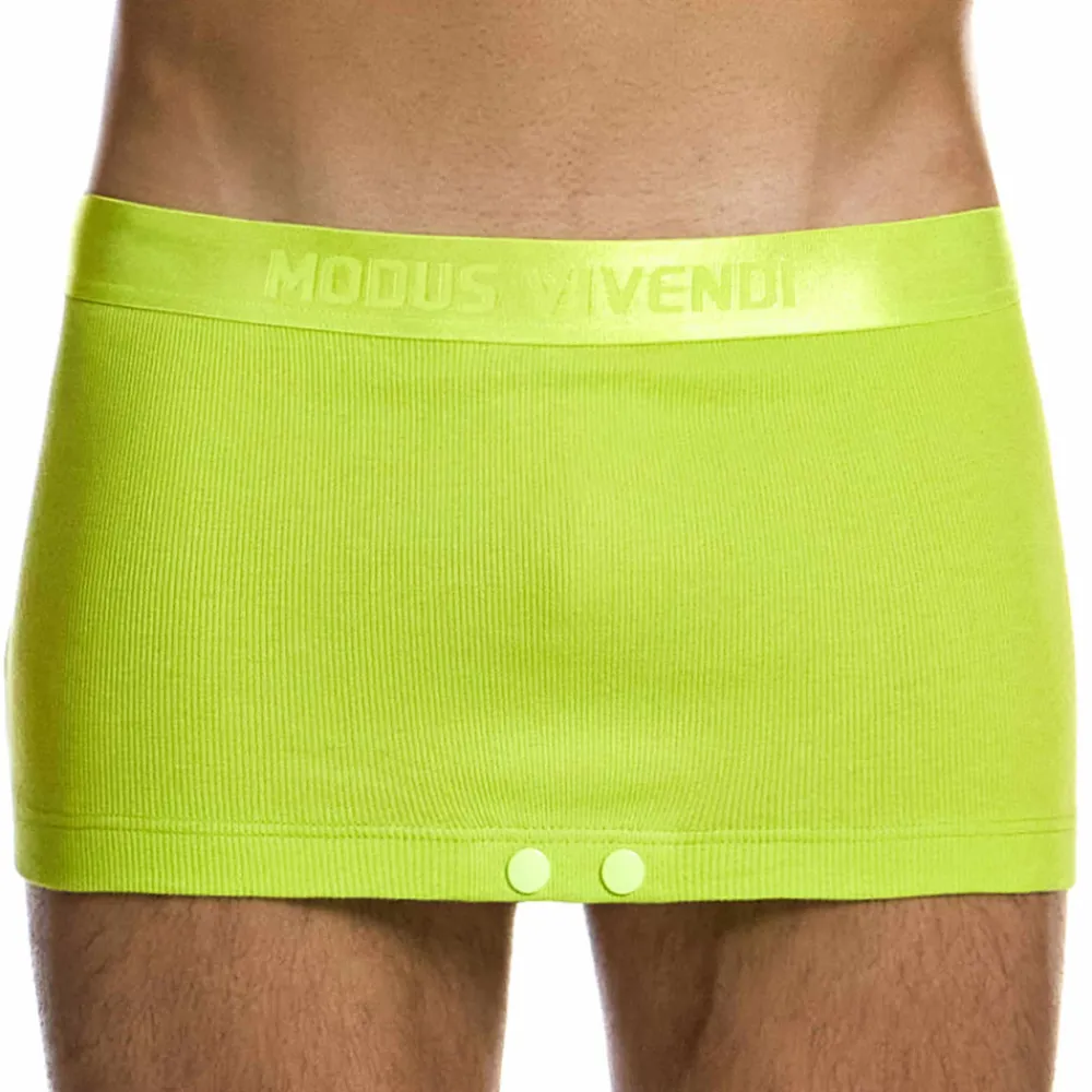 Boxer en coton côtelé doux et très confortable. Tissu bio certifié Oeko-Tex. Sexy et très original, il se transforme en mini jupe lorsque l’on dégrafe les deux boutons-pression situés au niveau de l’entre-jambe. Ceinture élastique satinée signée Modus Vivendi.