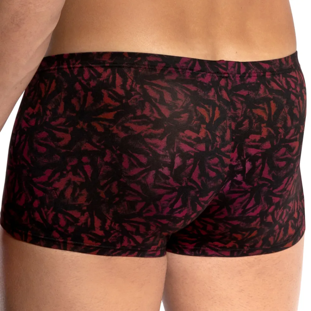 Boxer taille basse en microfibre très douce et légère. Imprimé abstrait sur fond noir,évoquant subtillement un tapis de feuilles. Coupe simple, élégante et très confortable. Etiquette Olaf Benz cousue sur la fine ceinture élastique recouverte.
