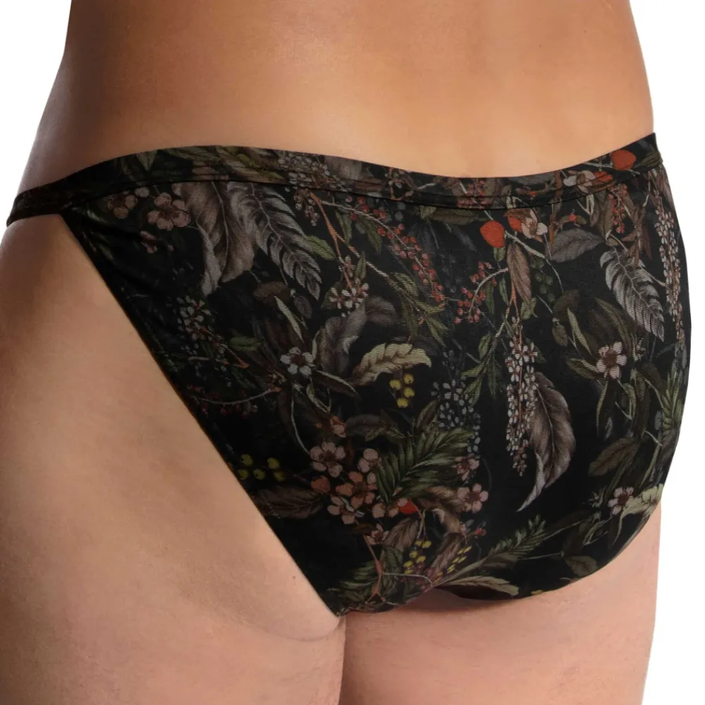 Slip minimaliste et très élégant en microfibre très douce et légère. Imprimé floral sur fond noir. Coupe tanga, sexy et confortable. Fine ceinture élastique avec étiquette Olaf Benz.