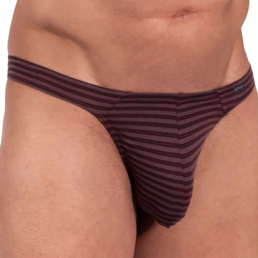 String sophistiqué en microfibre fine et légère, très agréable au contact de la peau. Alternance de fines rayures rouges et noires. Coupe simple, élégante et confortable.