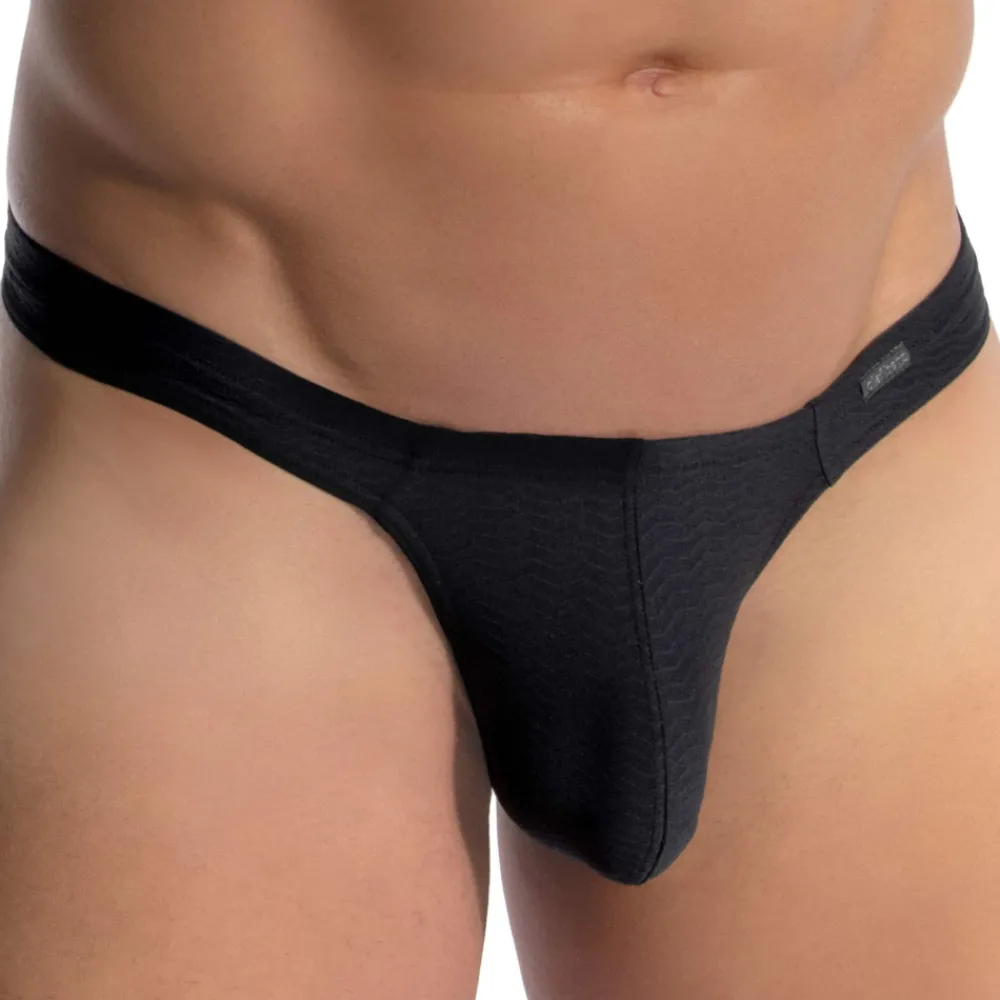 String minimaliste et très élégant en microfibre extensible, douce et légère. Motif ondulé ton-sur-ton en relief. Coupe sexy et confortable. Fine ceinture élastique recouverte avec étiquette Olaf Benz.