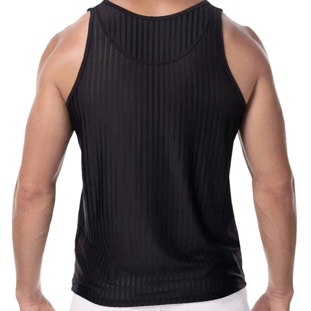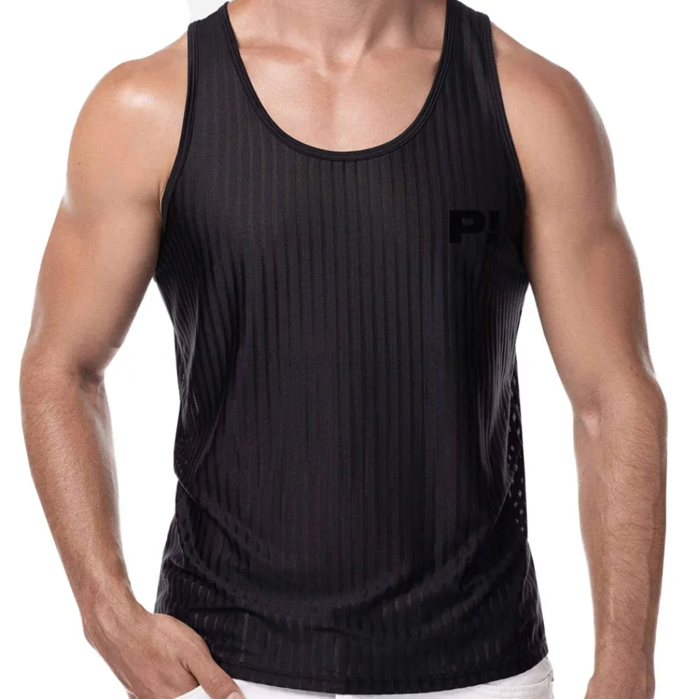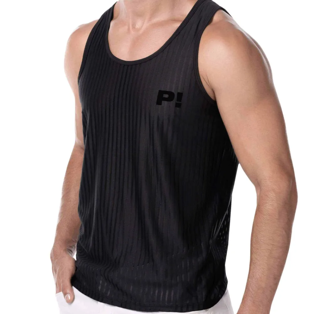Débardeur super confortable en microfibre extensible, douce et respirante. Conçu pour mettre en valeur votre silhouette. Alternance sophistiquée de rayures verticales transparentes et opaques. Bordures du col et des manches en micro-mesh. Logo P! floqué sur la poitrine.
