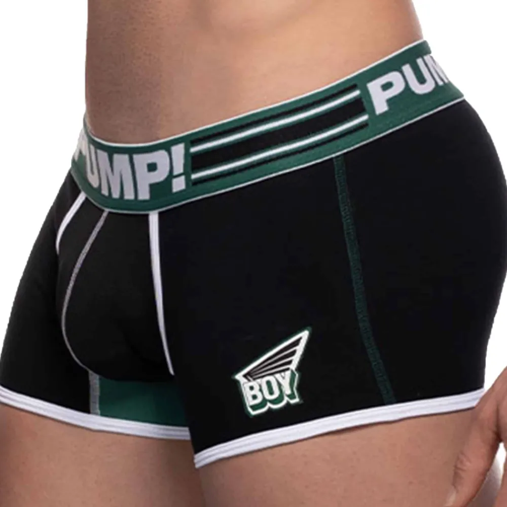 Boxer court en coton stretch doux et confortable. Poche frontale préformée en micro mesh doublé de coton. Logo Boy sur la cuisse gauche. Bordures des cuisses élastiquées. Ceinture élastique large signée PUMP!.