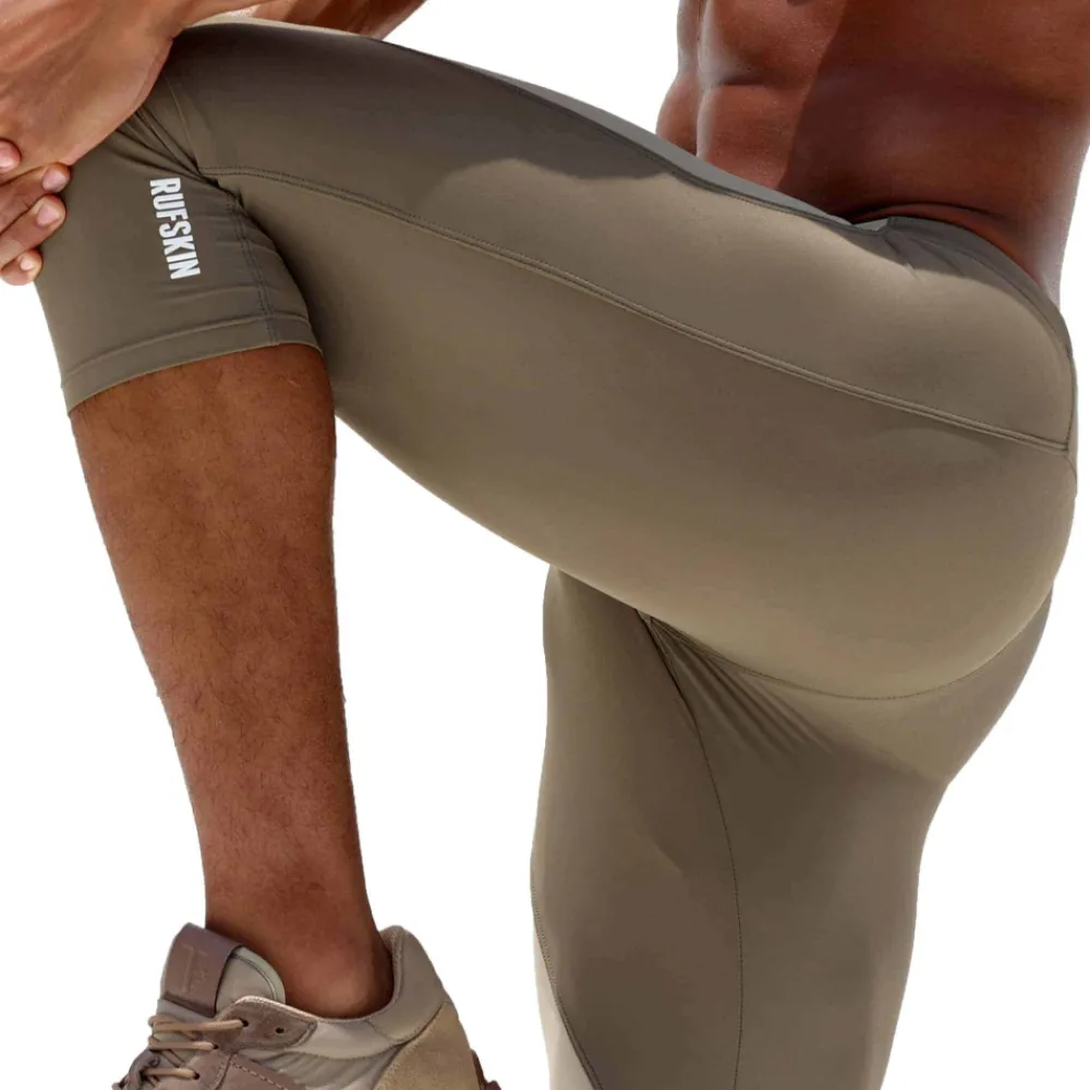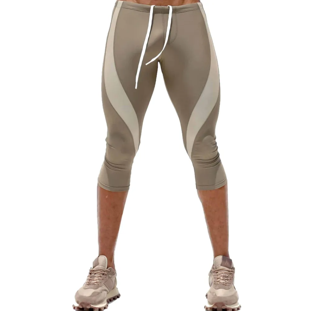 Legging 3/4 en microfibre extensible de qualité supérieure. Tissu à mémoire de forme évacuant rapidement la transpiration. Bandes latérales contrastées qui enveloppent les hanches et se terminent au niveau des genoux. Logo Rufskin sur le mollet gauche. Braguette factice. Ceinture élastique avec cordon de serrage intérieur. Fabriqué en Californie.