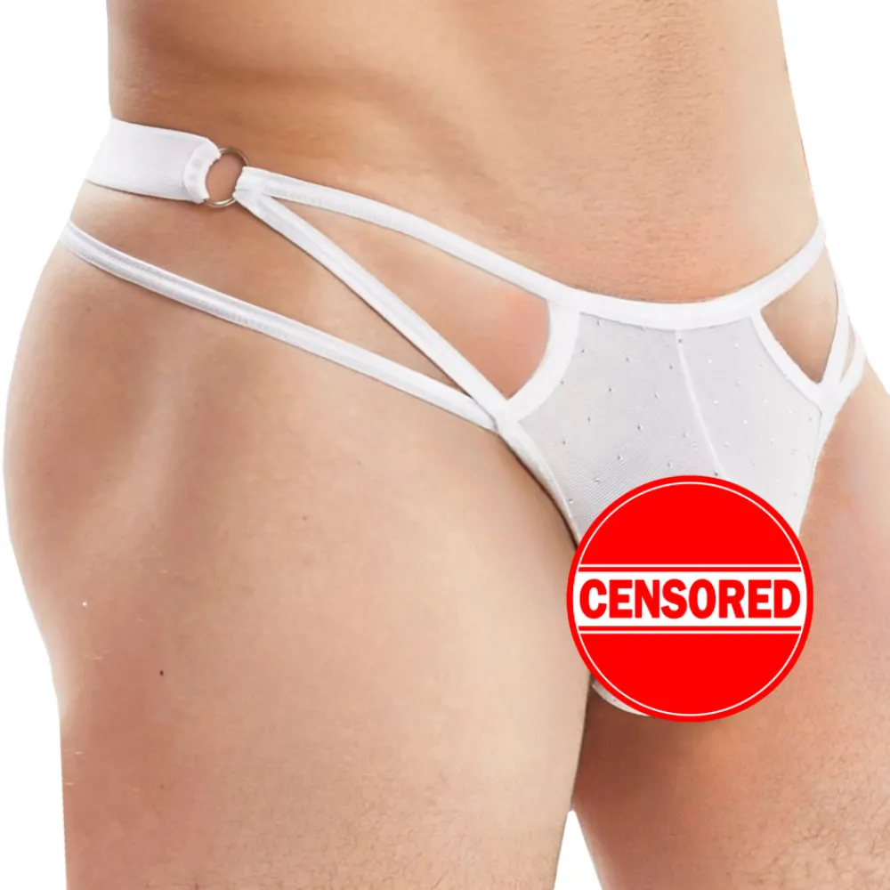 String taille basse très sexy en résille extensible transparente, ornée de strass scintillants. Design audacieux constitué de lanières fines reliées par de petits anneaux métalliques. Processus de fabrication respectueux de l’environnement et certifié Oeko-Tex.