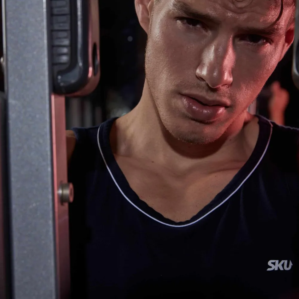 Débardeur sport et sexy en coton premium doux et extensible de couleur intense. Cintré juste comme il faut, il valorisera votre musculature sans gêner vos mouvements. Coupe courte et arrondie en bas, pour tomber parfaitement sur un pantalon. Le col rond est subtilement souligné par un liseré de couleur contrastée. Logo SKU sur la poitrine.