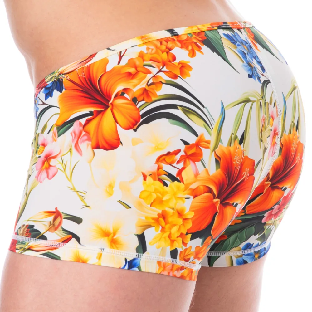 Boxer taille basse en microfibre extensible ultra douce et légère, pour un effet seconde peau. Superbe imprimé tropical original et intense. Poche frontale ergonomique assurant un maintien exceptionnel. Confort enveloppant sur les fesses. Etiquette SKU cousue sur la fine ceinture élastique.