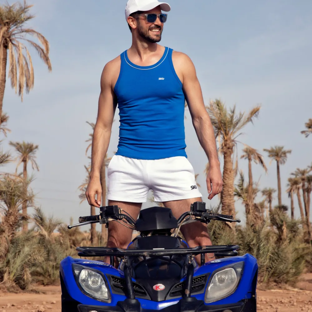 Short de sport très confortable en molleton 100% coton. Coupe courte, ajustée et échancrée sur les côtés. 2 poches latérales et une poche arrière. Logo SKU imprimé sur la cuisse gauche. Ceinture élastique recouverte.