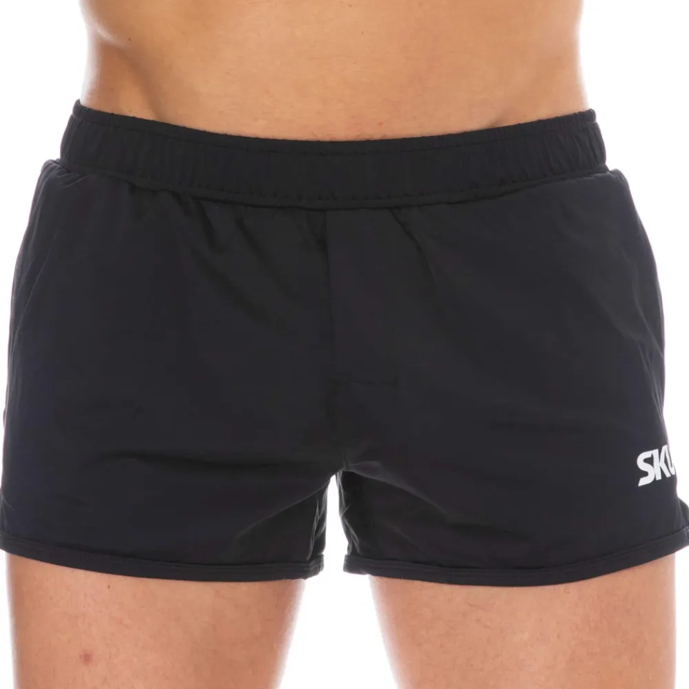 Short de bain sport en microfibre extensible séchant rapidement. Slip intérieur en mesh fin pour plus de confort. Petite fente sur le côté pour une plus grande liberté de mouvement. Logo SKU imprimé sur la cuisse gauche. Braguette factice. Ceinture élastique.