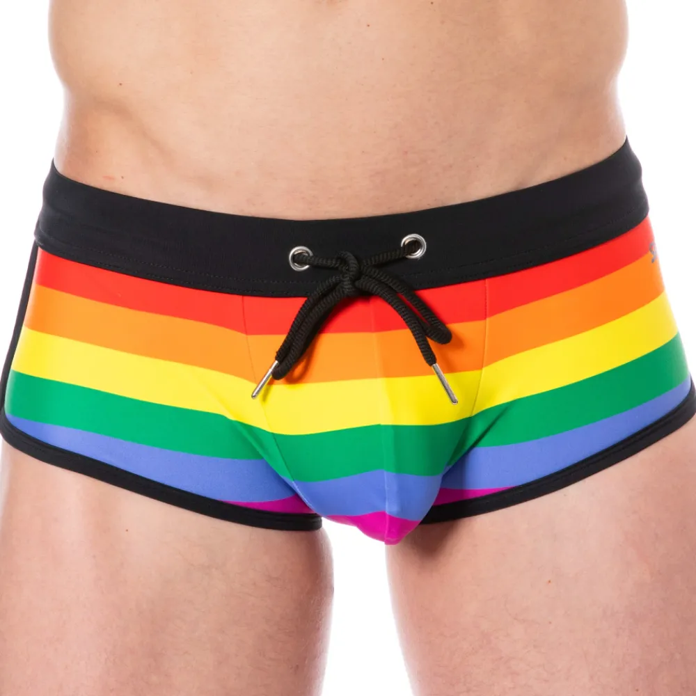 Shorty de bain en microfibre séchant rapidement. Imprimé rayé aux couleurs de l’arc-en-ciel. Message inclusif Good As You sur les fesses. Coupe taille basse très ajustée. Poche frontale doublée. Bordures de couleur contrastée. Logo SKU imprimé sur la cuisse gauche. Ceinture élastique avec cordon de serrage.