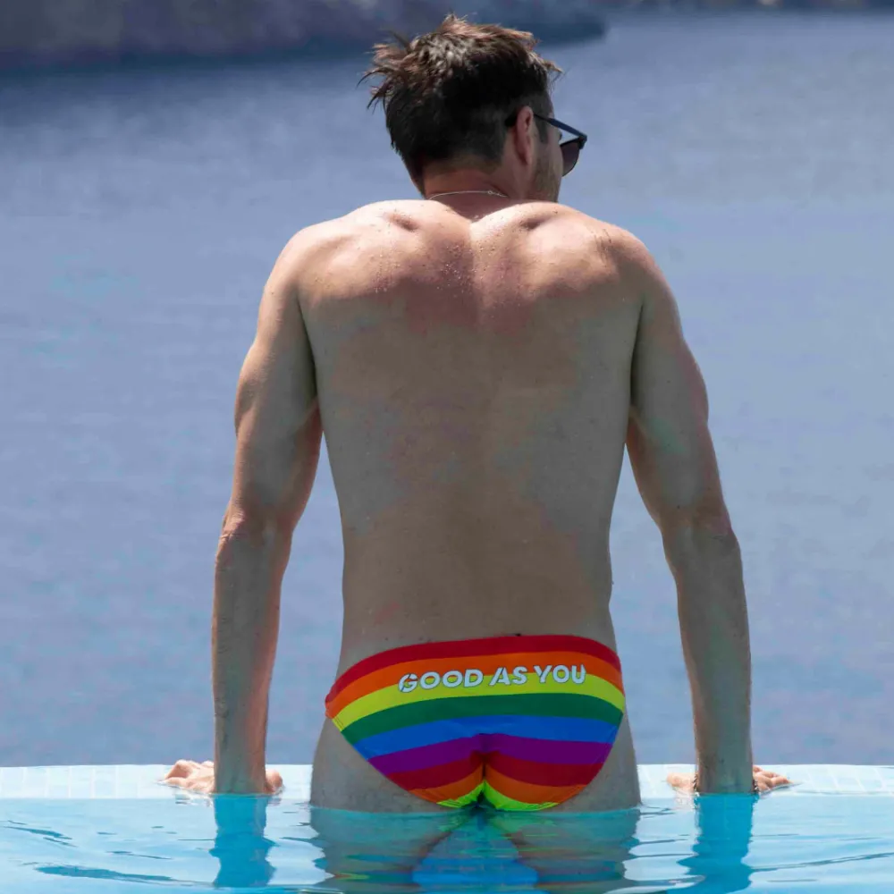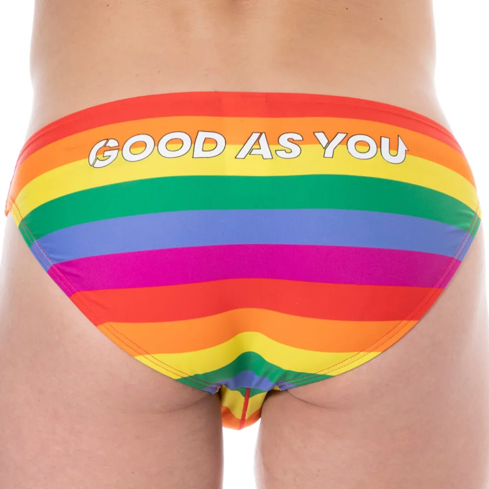 Mini slip de bain en microfibre séchant rapidement. Imprimé rayé aux couleurs de l’arc-en-ciel. Message inclusif Good As You sur les fesses. Coupe taille basse très ajustée. Poche frontale non doublée. Logo SKU imprimé sur la hanche gauche. Fine ceinture élastique.
